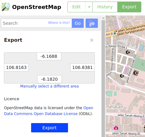 Before we use Osmosis, we have to prepare the map area which we will extract its road networks. Go to the OpenStreetMap website then made some search in it. After that click the green Export button then click the blue Export button as shown in the following picture. Then save the exported file to the desired directory. The file itself will have .osm extension.