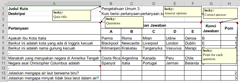 - After that, please download the create_form.xlsx. Please pay attention to some important sections of that file. There are specific section for us to put the quiz title, description, list of questions, answer options, correct answer, point, and also the separator to create new page or section in Google Form.