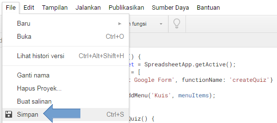 - Now there will be a new menu Kuis after the Help menu. Click it then click Buat Google Form.