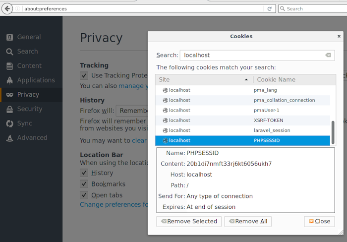 Now, let's take a look at the cookie in your web browser. Open a new tab then type about:preferences in the address bar. Click the Privacy menu, then click the remove individual cookies link. There might be a lot of cookies there, but you can fillter them by typing localhost on the Search texfield. You can find the PHPSESSID cookie the click it to see its value. Indeed, it will contain the random string that I mention previously.