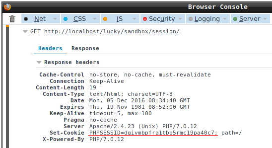 Access that file through the web browser and you will see that the page output the session content that we set in the previous page. After that, please take a look at the browser console. Expand the request detail of the URL in that console and see the Request headers section.