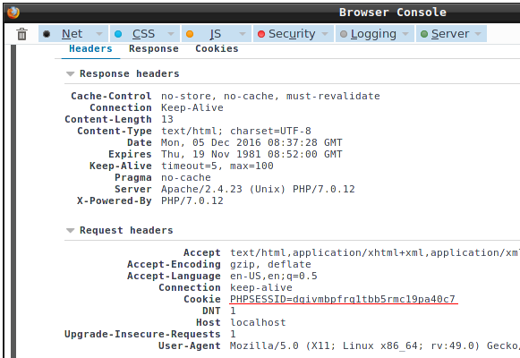 You will see the Cookie PHPSESSID=20b1di7nmft33rj6kt6056ukh7 in that header. Everytime we made a request, that cookie will be sent to the server. And that random string will be used by the web application to check the existance and the content of session file, in this case sess_20b1di7nmft33rj6kt6056ukh7. By using this method the web application is able to know who you are.