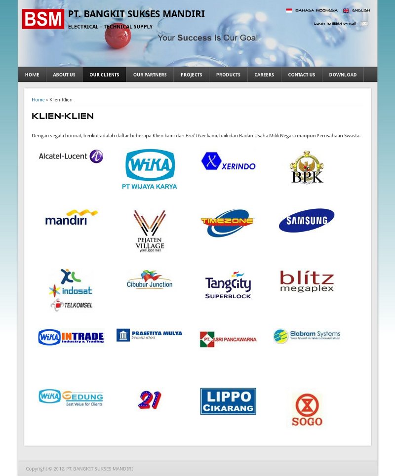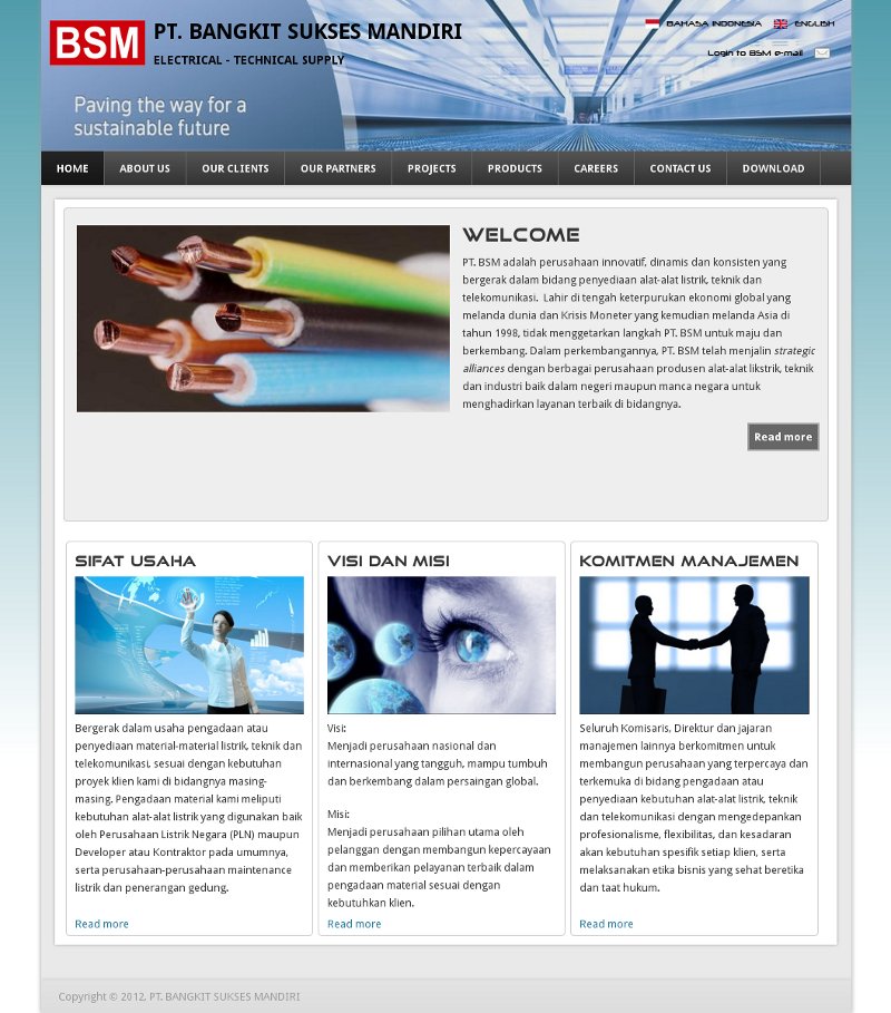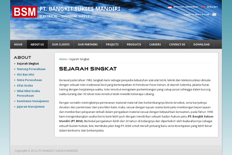PT. Bangkit Sukses Mandiri is a company located in Indonesia which provide the technical and electrical supply for development and construction project. Bangkitsuksesmandiri.com is the company profile website which is built based on Drupal 7. Drupal was chosen because its wonderful flexibility and extendability. Besides that, the great multilanguage module is also the main reason why Drupal is chosen.