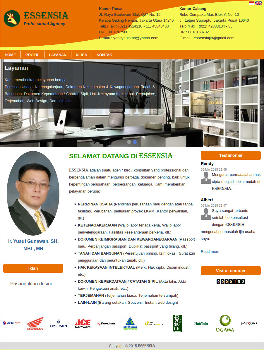 This is a company profile website for a law consultant firm, Essensia. Drupal 7 is the main core and also some excellent modules such as Views for creating user friendly backend interface for managing content, i18n for the multilanguage feature, and Webform for creating custom contact form. There are also some costum modules for managing slideshow at home page and displaying visitor counter. For the theme, Zen is used as the based theme. With its excellent responsive layout this site is also compatible with mobile device.